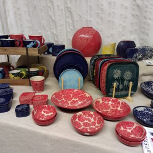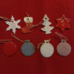 Außer meinen Bechern, Tellern, Schalen und Vasen mit individuellen Mustern bringe ich auch die beliebten Anhänger für den Weihnachtsbaum mit.
