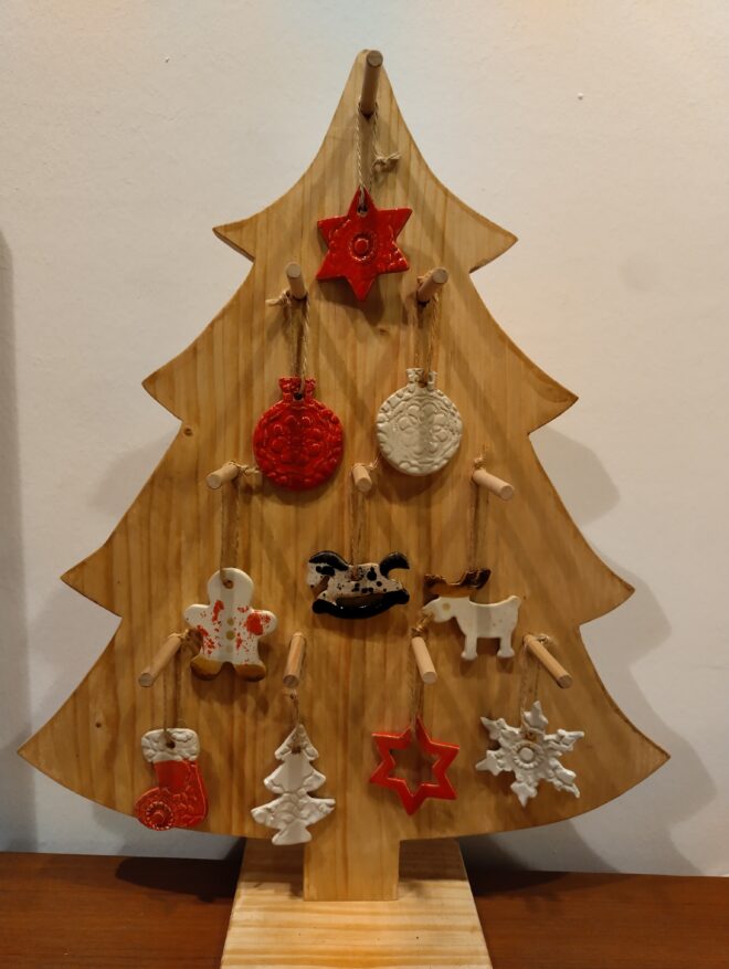 Mit viel Geduld habe ich ganz individuellen Weihnachtsschmuck getöpfert. Besonders schön am Weihnachtsbaum – auch draußen, denn sie sind frostfest.